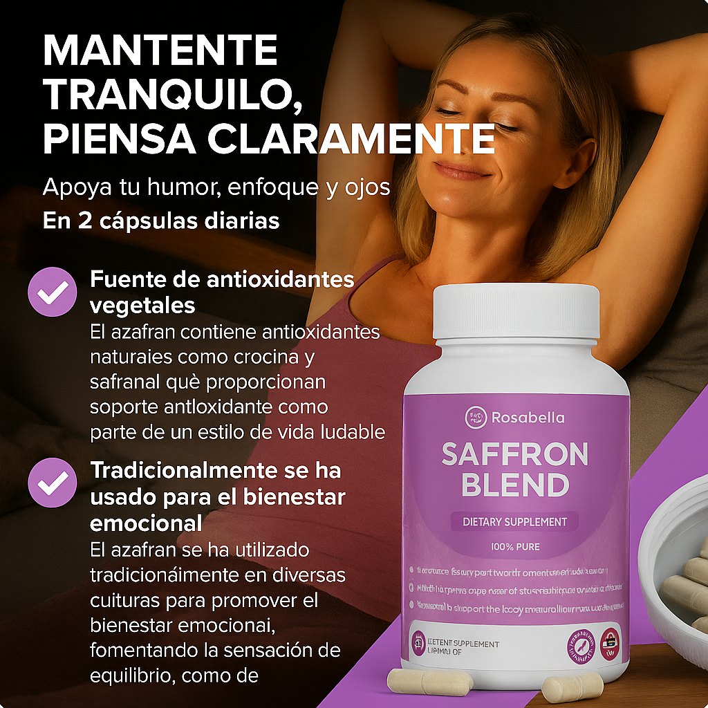 🌸 Un suplemento premium que combina Azafrán, Vitamina B6, Magnesio, L-Teanina y extractos herbales para ayudarte a mantener el equilibrio mental, apoyar tu bienestar emocional y favorecer tu salud cardiovascular, de manera natural y segura.